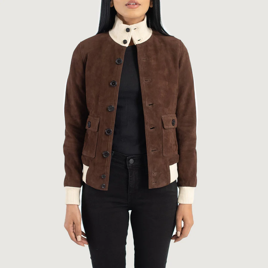 Stay effortlessly elegant in the Sasha A1 Mocha Suede Bomber Jacket, made of genuine goatskin suede for a silky and opulent texture. The warm mocha hue and quilted polyester lining make it ideal for chilly weather, providing both comfort and a sophisticated appearance. It features a button closure, rib-knit collar, and cuffs for a classic bomber look with a modern twist. It has two outer and two inner pockets, making it ideal for everyday use. To maintain the suede’s texture and color, lightly brush it with a soft cloth and keep it away from water and direct sunlight.