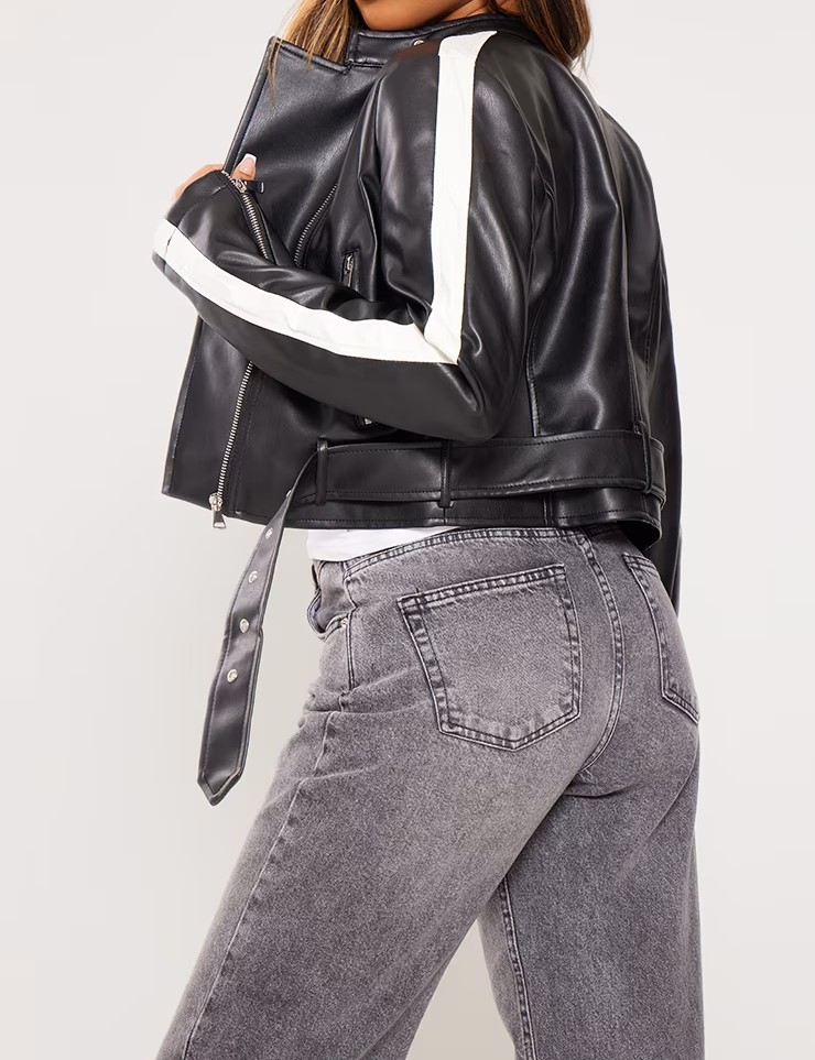 This Black Faux Leather Cropped Biker Jacket is a chic and adaptable item that goes well with dresses, skirts, or jeans. It adds edge to your outfit. It has a zip-up front and long sleeves for a sleek, contemporary fit. It is made of high-quality imitation leather with contrast panels for a striking biker vibe. The cropped shape gives traditional biker flair a modern, stylish touch. Also check our variety of women’s moto jackets with premium quality without premium pricing.