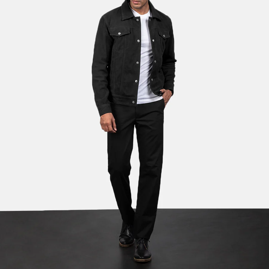 Step out in style with the Black Suede Trucker Jacket, made of fine goatskin suede for a soft, rich feel. The quilted polyester lining keeps you warm and comfortable, while the snap-button closure, shirt-style collar, and adjustable waist straps provide a modern, tailored look. This jacket combines functionality with traditional design, with four outer and two inside pockets. Ideal for casual occasions, evenings, or adding edge to your everyday wardrobe. To maintain its appearance, lightly brush the suede to eliminate dust and prevent getting it wet or machine cleaning.