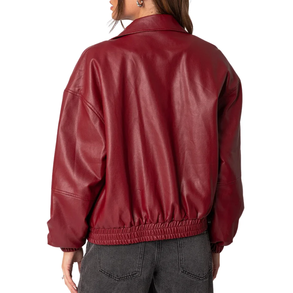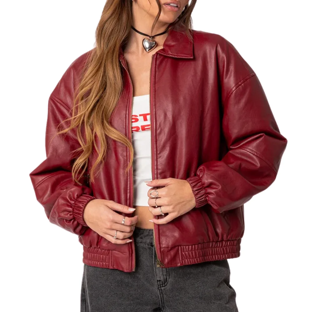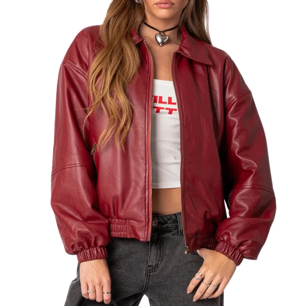 Velvro Leather – VL-141 Mary Maroon Bomber Leather Jacket with Fast Shipping and 30 Days Easy Return Warranty.