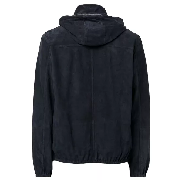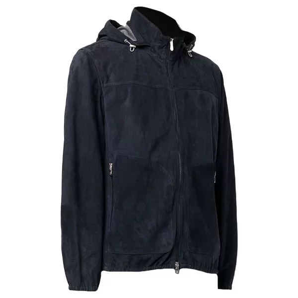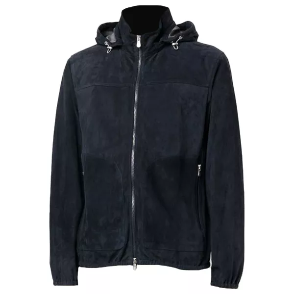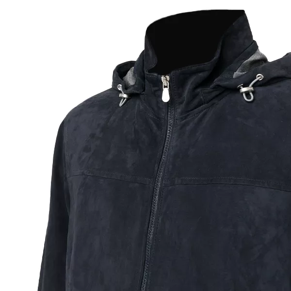 Men’s Navy Blue Suede Leather Jacket With Hood
