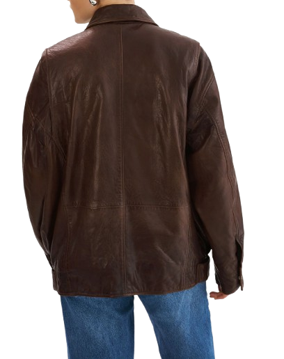 Introducing the Theia Leather Bomber Jacket, a remarkable blend of quality, design, and comfort. This jacket, which is made entirely of lamb leather and has a casual, oversized fit, has drop shoulders, a shirt collar, and a quilted inside for comfort and warmth. Welt pockets provide convenient storage, while snap-button cuffs and hip tabs add customizable details. It adds effortless edge whether you’re dressing up for a night out or layering over casual ensembles. Also check-out our wide range of Women’s Bomber Jacket collection, offering premium leather without premium prices