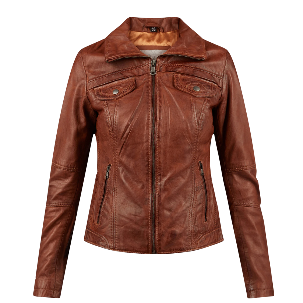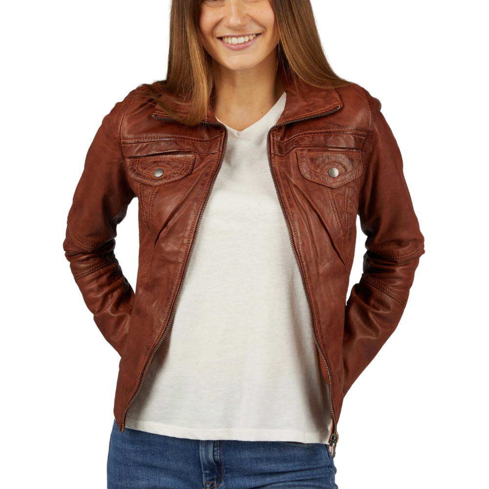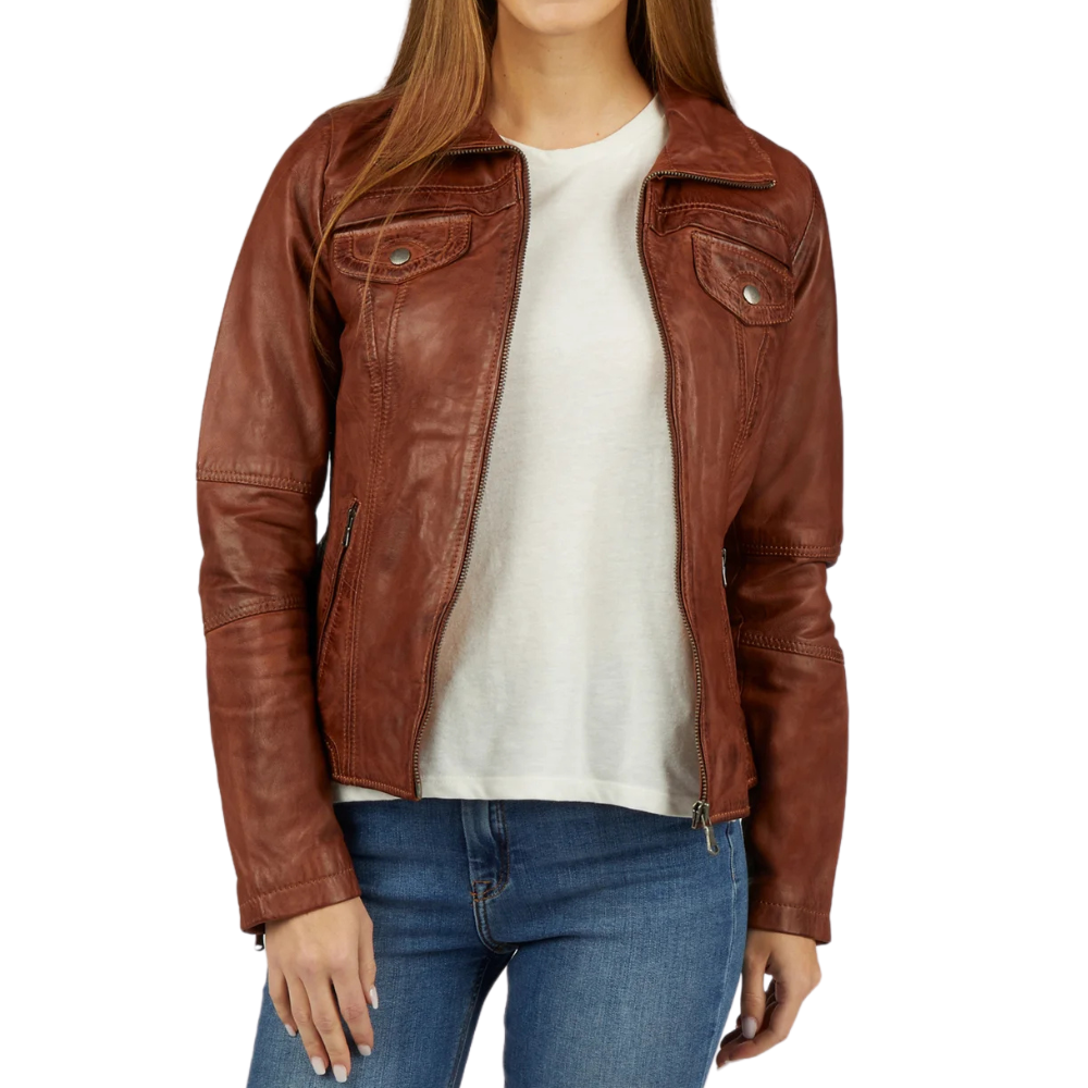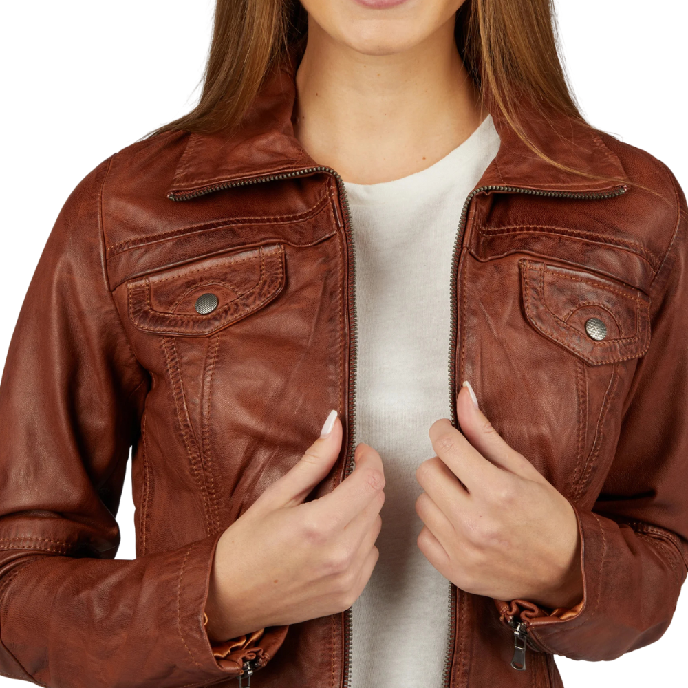 The Women’s Brown Leather Trucker Jacket will enhance your appearance because it is made entirely of sheepskin leather, which has a soft yet sturdy touch. It skillfully combines classic elegance with contemporary flair thanks to its streamlined trucker lines and classic collar. Its soft inner lining guarantees comfort throughout the day, while its four front pockets and one inner pocket keep your necessities close to reach. Warmth and adaptability are added to any wardrobe by the deep brown hue. Get variety of women’s leather jackets according to your style, fit and need.