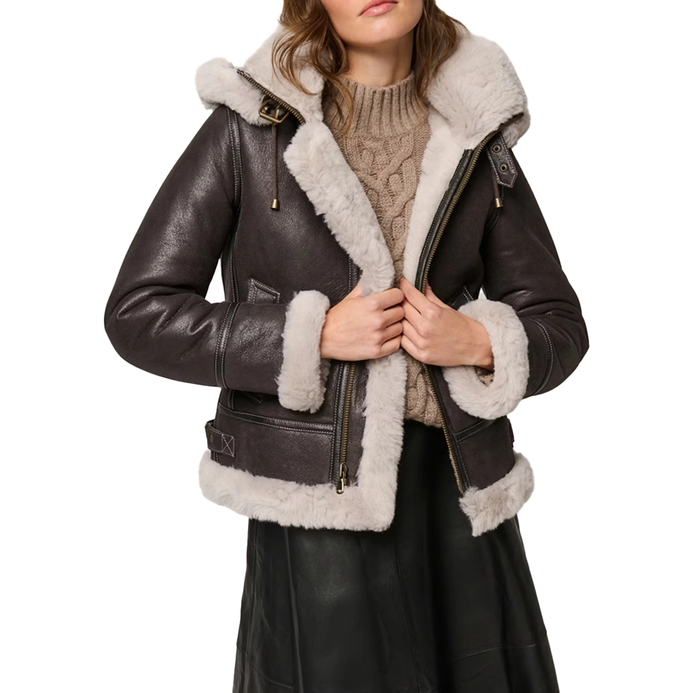 Velvro Leather – VL-044 Women’s Dark Brown Leather Shearling Coat Aviator Jacket with Fast Shipping and 30 Days Easy Return Warranty.